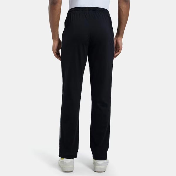 Track pantsA pair of black solid track pants, has an elasticated waistband with drawstring closure, two pockets
